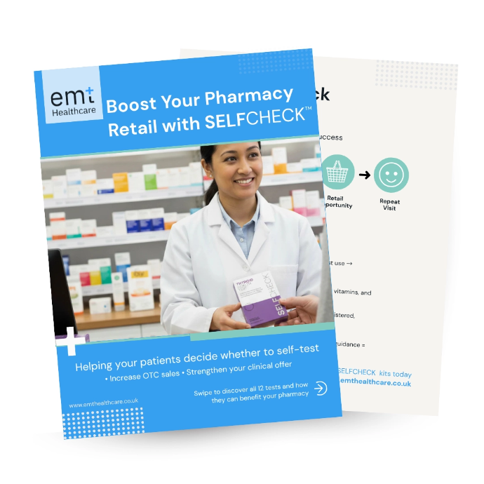 Discover how SelfCheck at-home health tests can boost your pharmacy retail growth and enhance patient engagement. Get your copy by downloading it directly or contacting us, and we’ll email it to you. Our team is here to support your pharmacy with consumables, retail offerings, and expert advice on the top products to stock year-round, helping you maximise both sales and patient satisfaction.